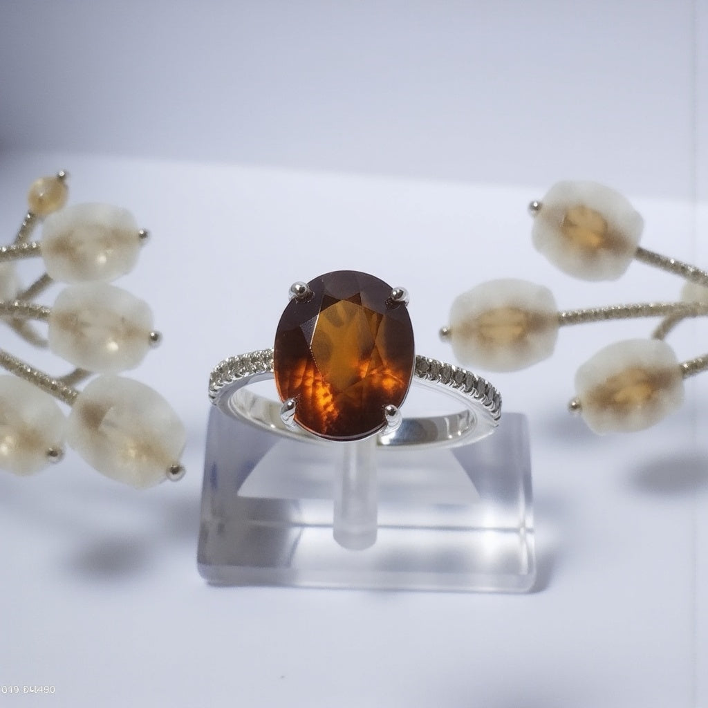 Ring with an oval shaped Garnet and Cubic Zircons in Stelring Silver
