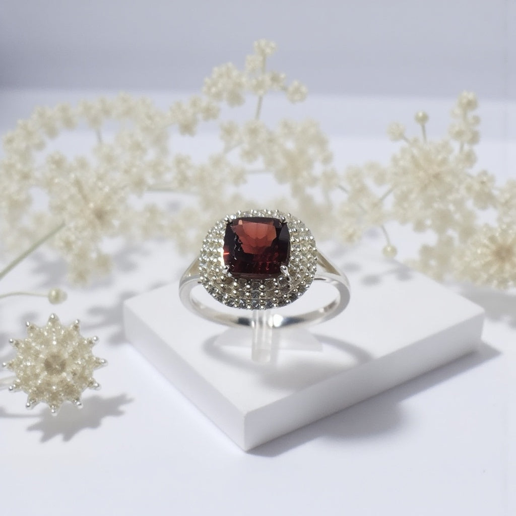 Triple cluster ring with a cusion shaped Garnet and Cubic Zircons in Sterling Silver